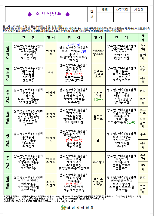 공지사항 26년 2월 1주 식단표 작성자 Admin 작성일 2026-02-12 10:55 조회 118 좋아요 0 싫어요 0 인쇄 « 26년 1월 4주 식단표 26년 2월 2주차 식단표(신관/본관) » 목록보기 답글쓰기 Powered by KBoard